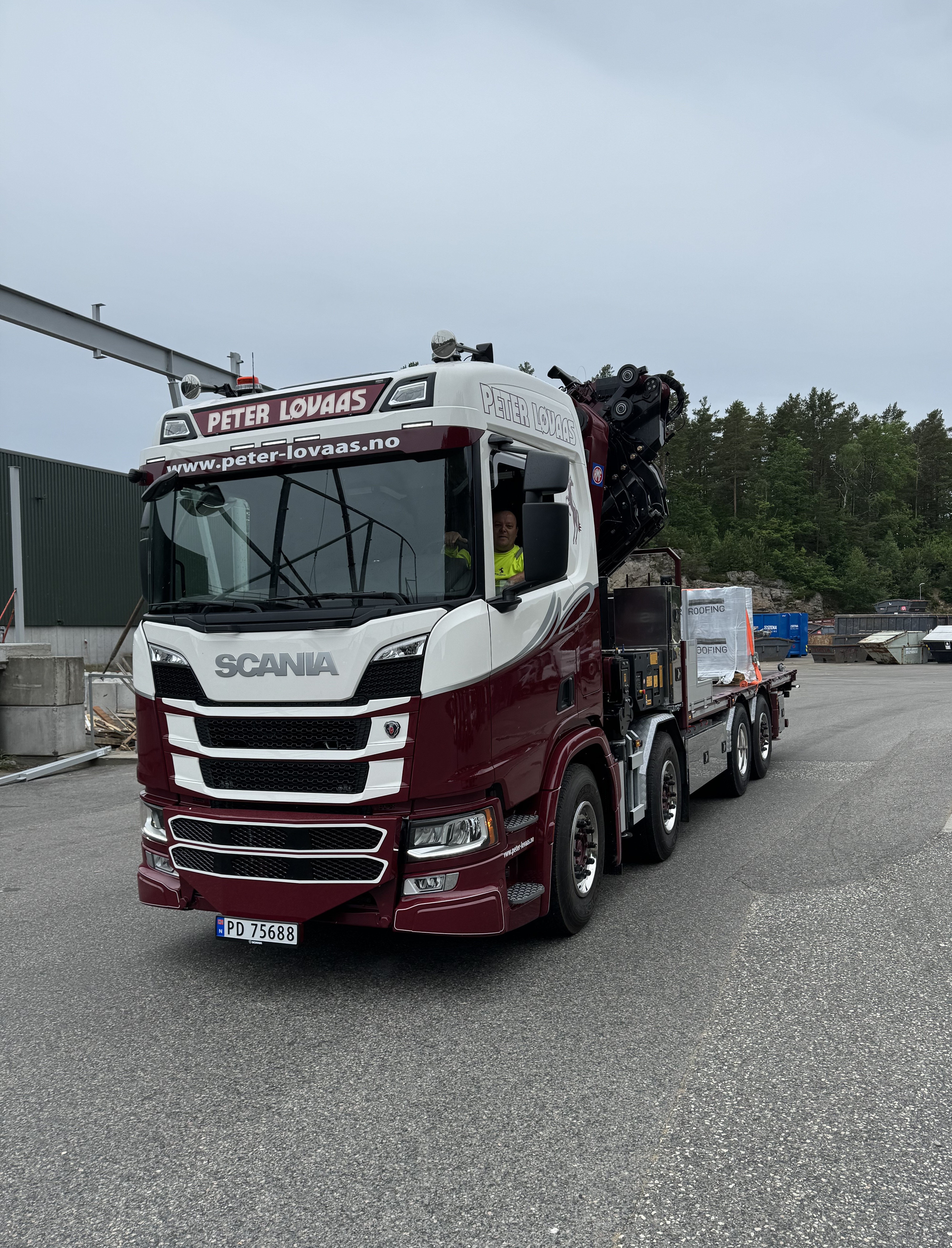 Peter Løvaas Transport har investert i flere nye biler i år, alle de de kjente og flotte Løvaas-fargene. Bildet viser vår sist ankomne kranbil, som kjøres av Mihai.